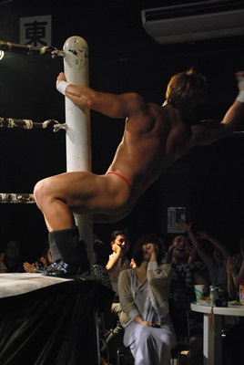 諸橋は場外に出て変なおじさんダンスからコーナーポストを使ってポールダンスっぽい何か(右写真)。