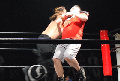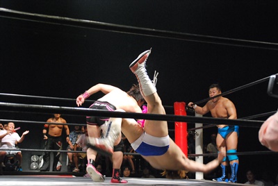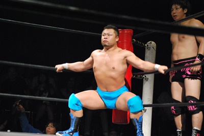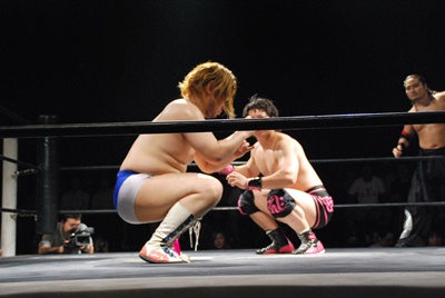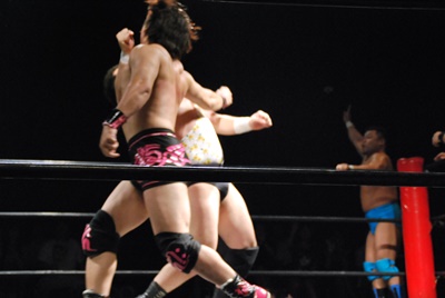 ディーノ真霜をコーナーに振って串刺しラリアット(右写真)、