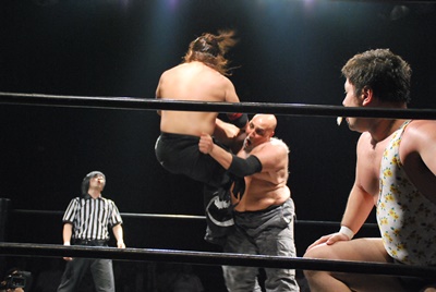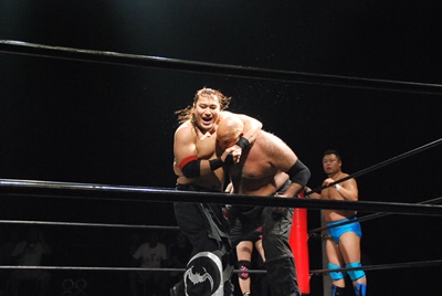 真霜ディーノのラリアットをかわしてボディスラム、石井がディーノにラリアット(左写真)。