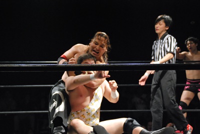 竜が真霜にラリアット(左写真)、