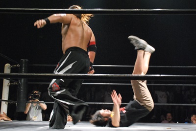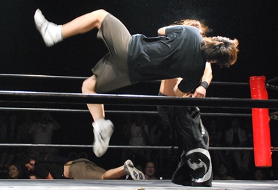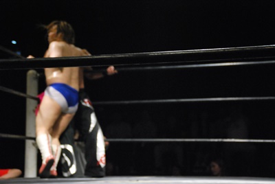 アントンがコーナーに上ってダイビングフィストドロップ、真霜かわす(右写真)。