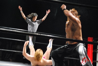 下ろしてラリアット(左写真)、カウント3。