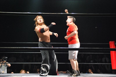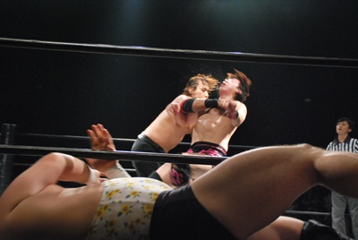 アントンは真霜の足にステップオーバートーホールドからラリアット(左写真)。