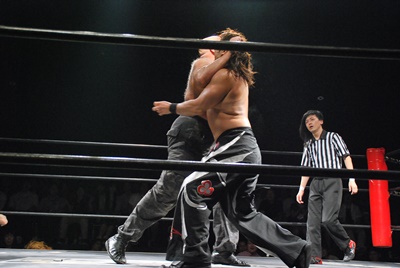 ラリアットを出そうとしない真霜にアントンがクレーム。「ちょっと待て。この試合のコンセプトくらい雑誌読んでチェックしろ。この試合俺たちは9割9分9厘ラリアットしか出さない。」(右写真)
