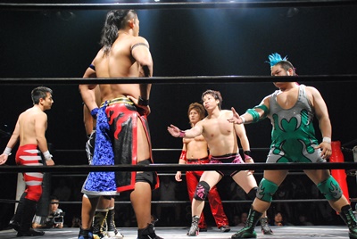 彰人とFUMAが入る、入江と高尾も入って6人ともリングに(右写真)。10分経過。