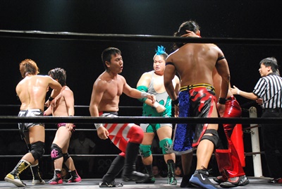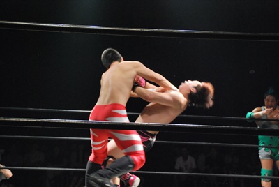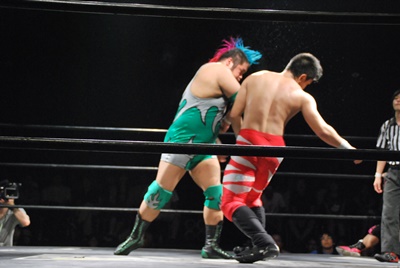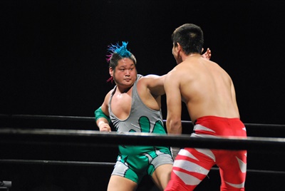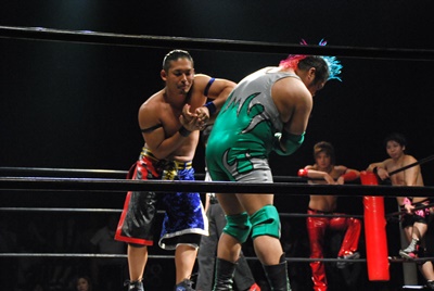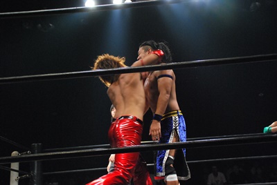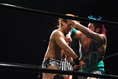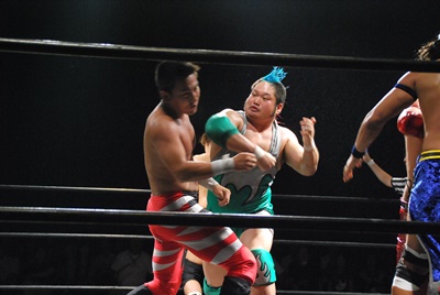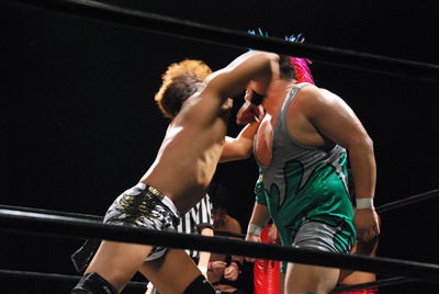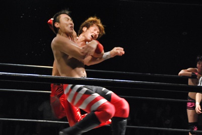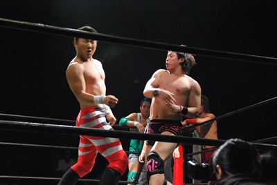 エルボーの打ち合い(右写真)、平田首投げからサッカーボールキック、エルボー打ち込んでFUMAにタッチ。FUMA石井にハンマーロック、石井切り返して高尾にタッチ。