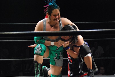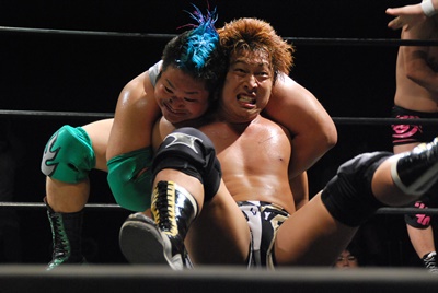 平田首投げからスリーパー(右写真)、入江立ち上がるとおんぶした状態でコーナーに下がり石井にタッチ。