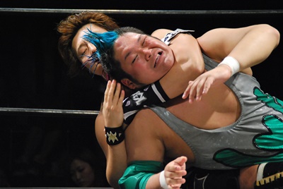 高尾もFUMAにハンマーロック(左写真)、FUMAカニばさみで倒してヘッドロック、彰人にタッチ。