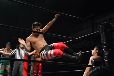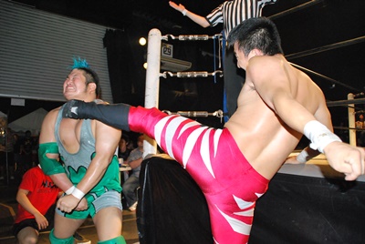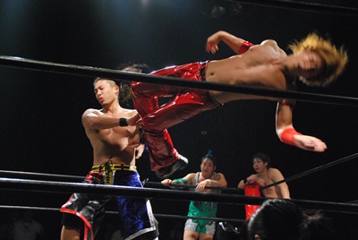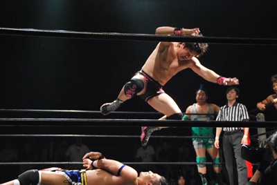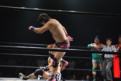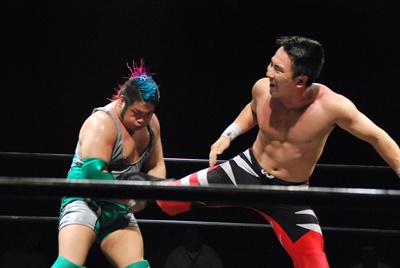 FUMAコーナーに振ってミドルキック連打から串刺しドロップキック(右写真)、カウント2。平田にタッチ。