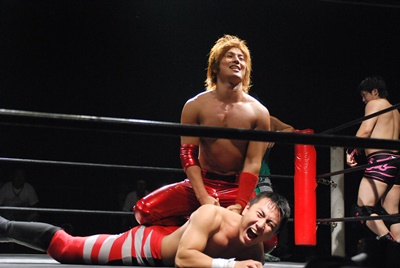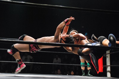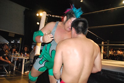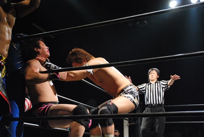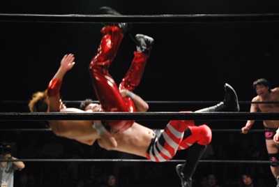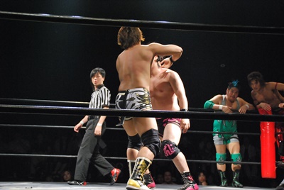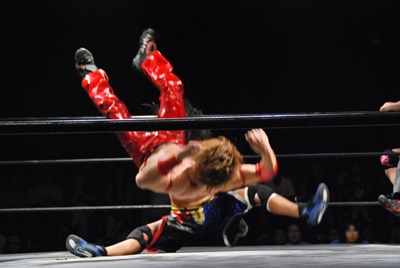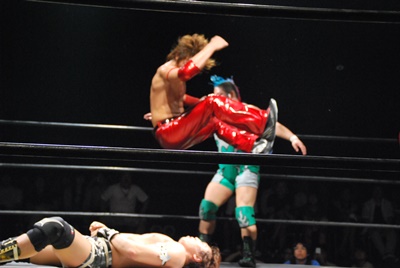 彰人ガットショットでコーナーに詰めてエルボー連打、ネックブリーカードロップ(右写真)、カウント2。平田にタッチ。
