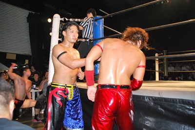 彰人石井を抱え上げてコーナーに、FUMAにタッチ。FUMA掌底、石井も張り手(左写真)。