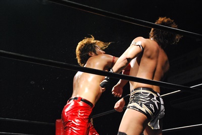 チョップ打ち合い、エルボー打ち合い(右写真)、高尾ロープに振ってドロップキック、カウント2。15分経過。