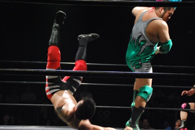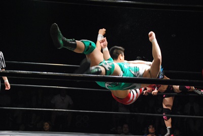 石井ロープに振ってバックエルボー、カウント2。入江にタッチ。入江ボディスラムからWARスペシャル(右写真)、平田ロープ。入江ボディスラム、平田ブロック、入江持ち上げる、平田着地してエルボー、逆にボディスラム、FUMAにタッチ。