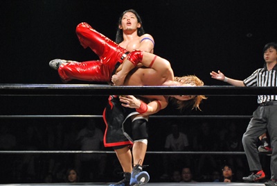入江ボディスラムからボディプレス、カウント2。平田入江にエルボー(左写真)、