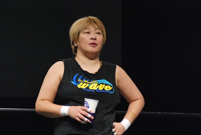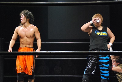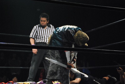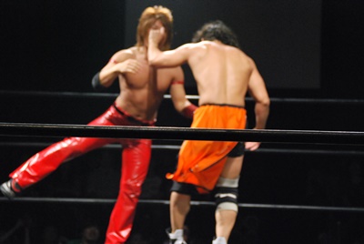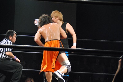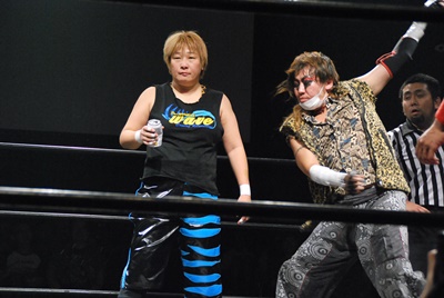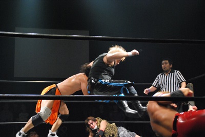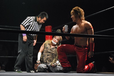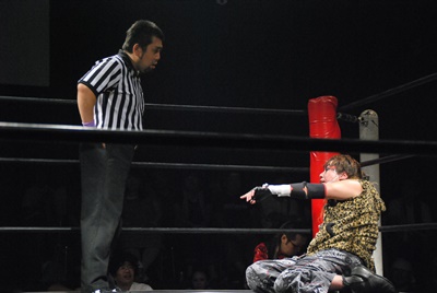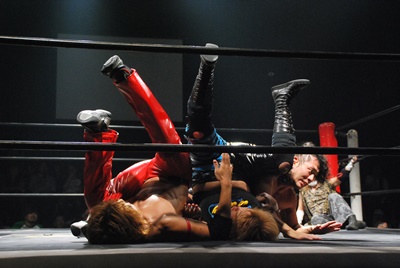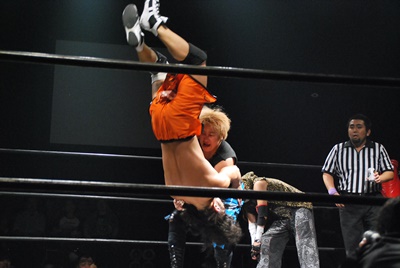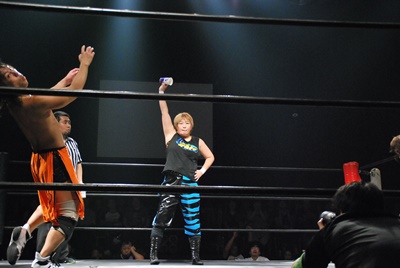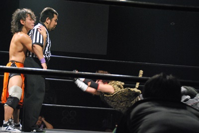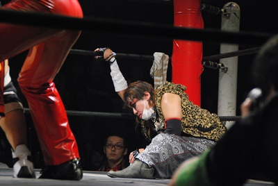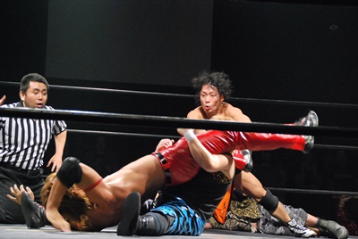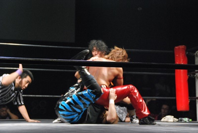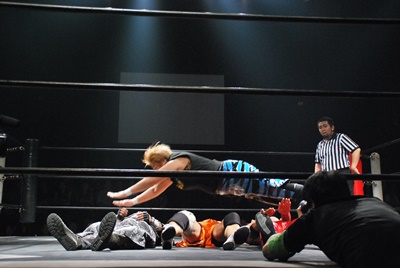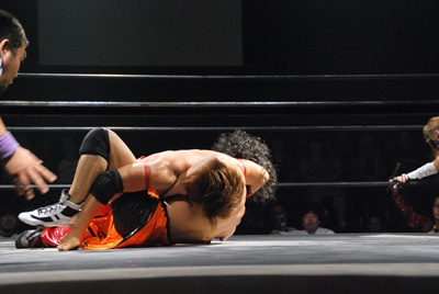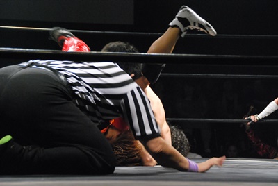 高尾逆にエビ固め(右写真)、カウント2。GAMIに3ペナルティ。