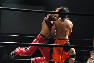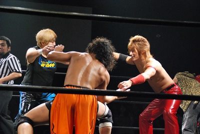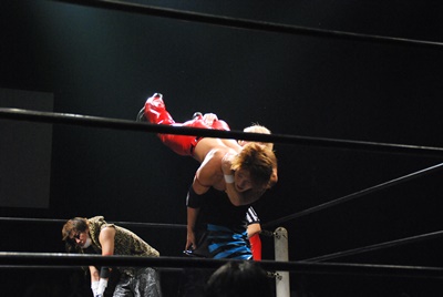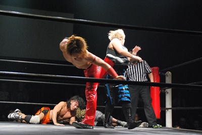バックの取り合い、腕の取り合いを3人で。高尾と高梨共闘、ダブルのガットショット。GAMI場外エスケープ。高梨と高尾ロープワーク、高尾ランニングエルボー(右写真)、カバー、カウント1。