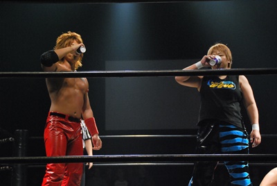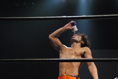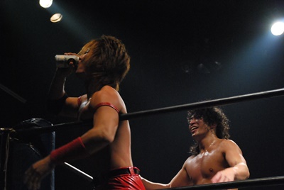 この試合は2カウントを取られたらペナルティとしてビール1杯飲まなきゃいけないというもの。高梨はちゃんぴろんだし、高尾も実は酒(主にビール)はDDT内1、2と言われるほど強いというのがこないだのトークショーで明らかになってるし、GAMIも酒豪で有名だが果たしてニラ(右写真)は?