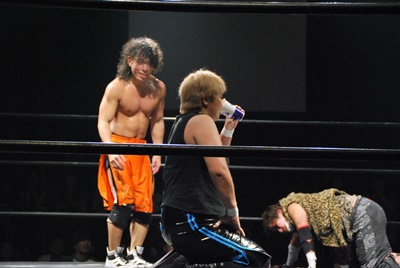 ニラ早くも酔ったのかコーナーに下がったため3人で試合開始(右写真)。