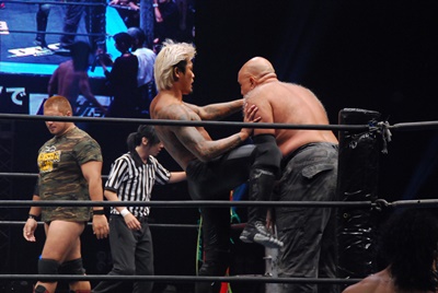 火野リングイン、高梨と彰人ダブルのブレーンバスター狙うが火野切り返す(右写真)。