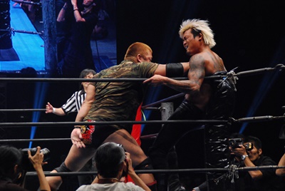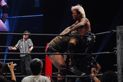 元帥が手を出しているのを見て憲二がエプロンに上がるが木曽レフェリーが注意(右写真)。