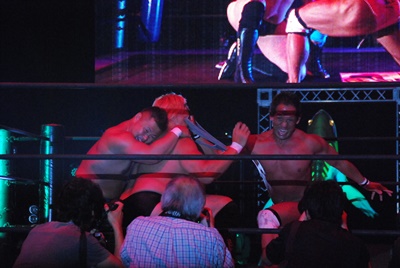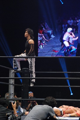 試合は山&MIKAMI組優勢に進む。MIKAMIが450°スプラッシュ狙ってコーナーに上る。するとメトロン星人の声(右写真)。