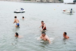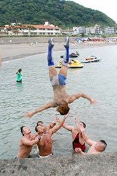 「何か起きたのか」とライフセーバーが出動したので慌てて戻る6人(右写真)。35分経過。