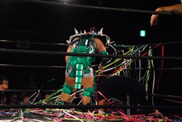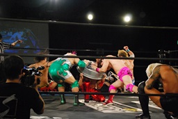 大石と彰人入って石井と入江をタライにぶつける(左写真)。彰人ロープに振ってヒップトス、カウント2。ボディスラム2発、カウント2。大石にタッチ。