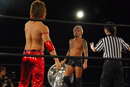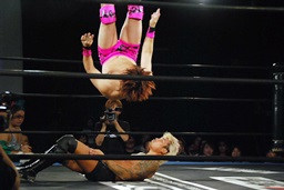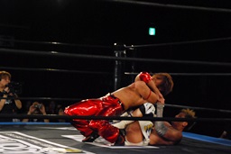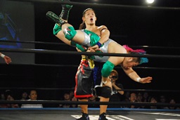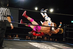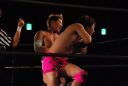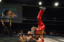 大石「行くでー」と言うとスイングDDT(右写真)、スタナー。ミラクルエクスタシー狙うが高尾着地。