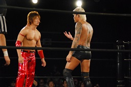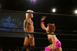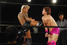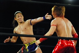彰人低空ドロップキックから俵返し(左写真)、坂口にタッチ。