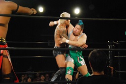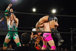 大石と彰人はダブルのガットショットからダブルのブレーンバスター狙うが入江は切り返して2人を投げる(右写真)。