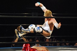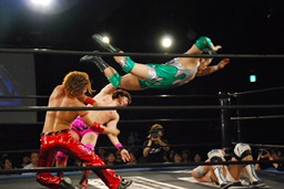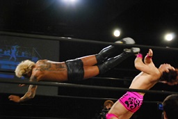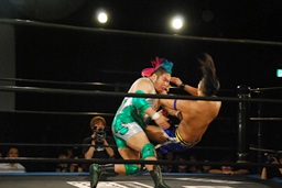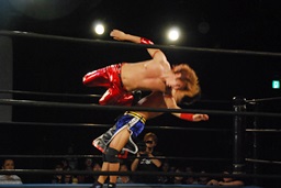 ロープに飛ぶ、高尾カウンターのドロップキック(左写真)、入江にタッチ。
