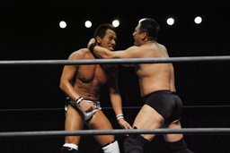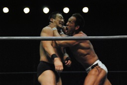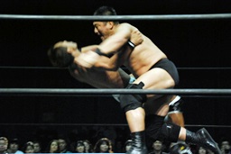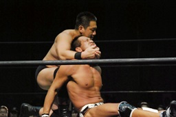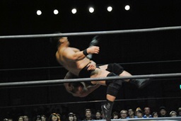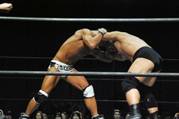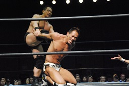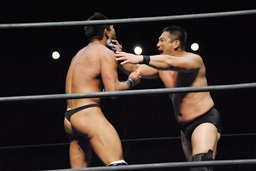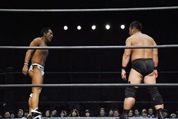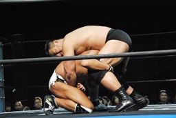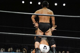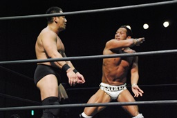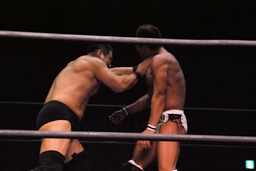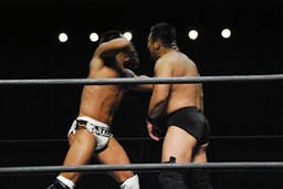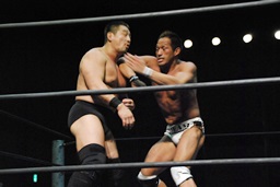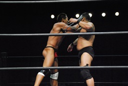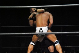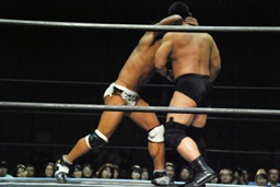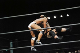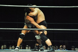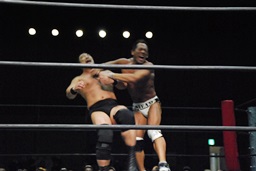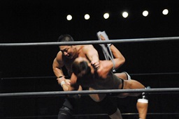 ロックアップ、高木ボディスラム狙う、マイケルブロックして逆にボディスラム狙うが高木ブロック(右写真)。