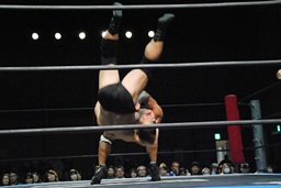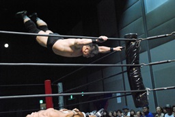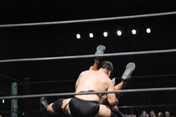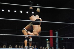 高木コーナーに振って串刺しエルボーからリバーススプラッシュ(右写真)、カウント2。この技に結構どよめきが。高木三四郎のシングルでは定番ムーヴだけど、高木のシングル自体地方では珍しかったかな?