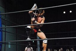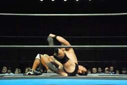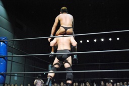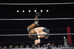 ボディスラム成功(右写真)。一発の重みが。カバー、カウント2。観客から大拍手。