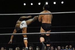 高木ストンピング、マイケルをロープに固定してヒップドロップ、カウント2。コーナーに振って突っ込む、マイケルカウンターのキック。高木再度突っ込む、マイケル今度は両足でキック(左写真)。