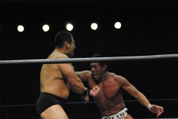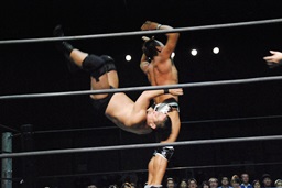 マイケルコーナーに上ってダイビングショルダーブロック、高木はキャッチングスタナーに切り返す(左写真)。カバー、カウント2。