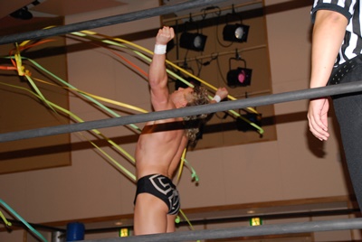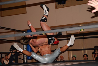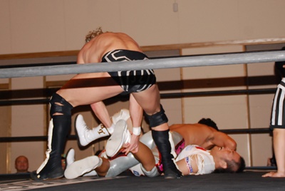 ケニーカニばさみ(右写真)からコタロークラッシャー、カウント2。5分経過。