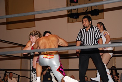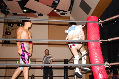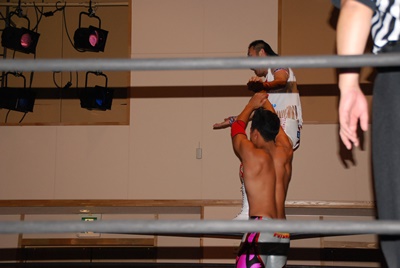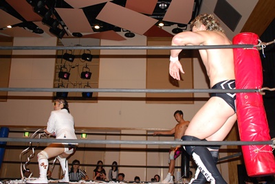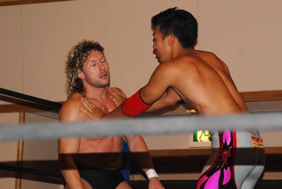 ばってんは無視してケニーと竹下で試合開始。ロックアップ(右写真)、