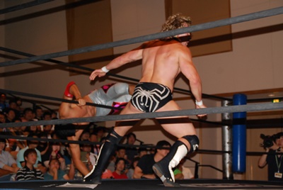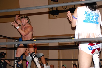 ばってんがコーナーからダイブ、ケニーはカウンターパンチ(左写真)。