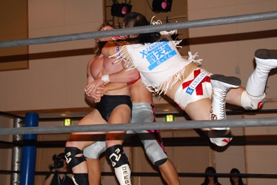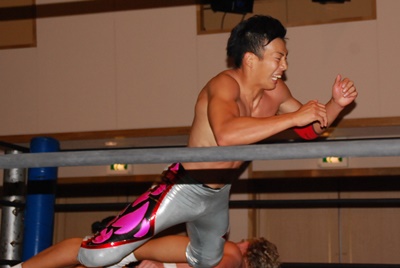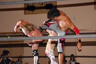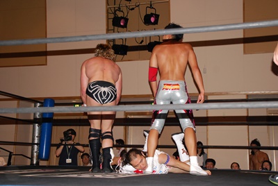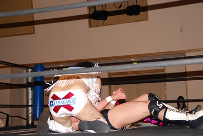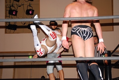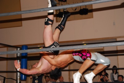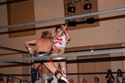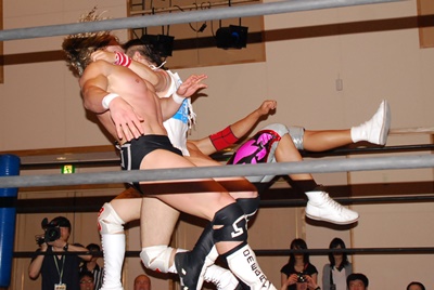 竹下再度バック取る、そこにばってんフライングチョップ(左写真)、2人折り重なって倒れる。