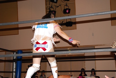 ばってんまだ試合には参加せず、ひたすらばってん多摩川音頭を続ける(左写真)。竹下がドロップキック。