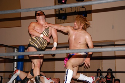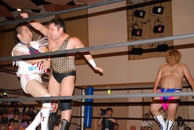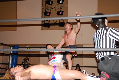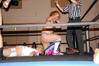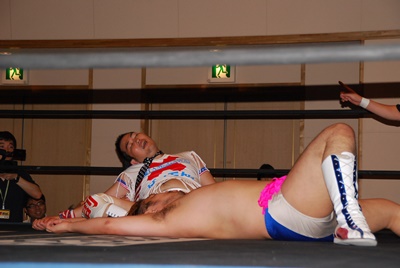 ケニーはばってんにベルト持ってのばってんボンバー、アントンの上にばってんを乗せる(右写真)。復活した木曽レフェリーがケニーにリング外に出るよう指示、ケニー出る。