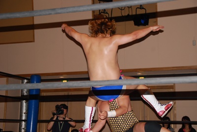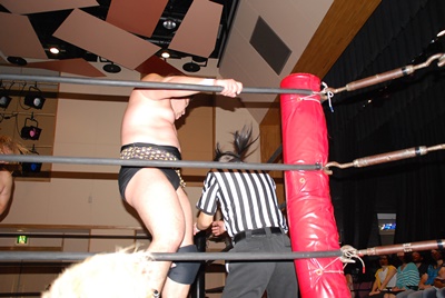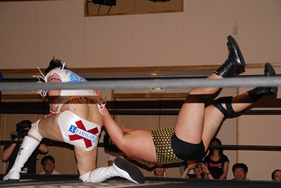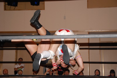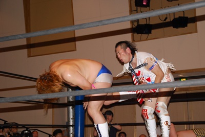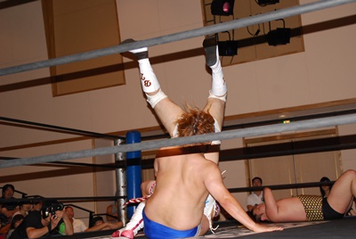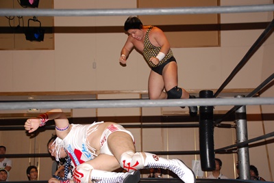 コーナーに上ってダイビングフィストドロップ、ばってんかわす(左写真)。