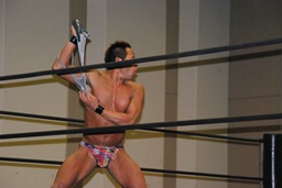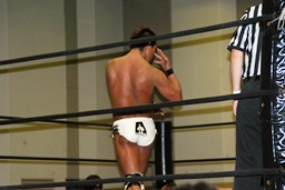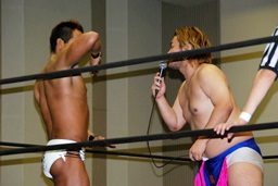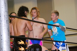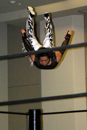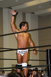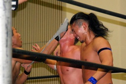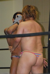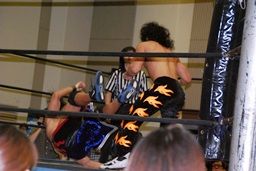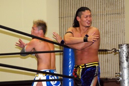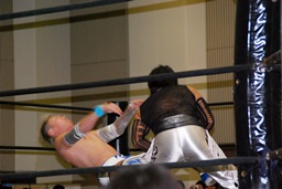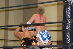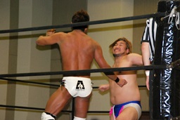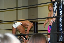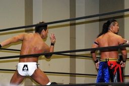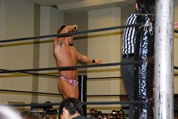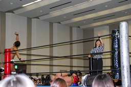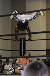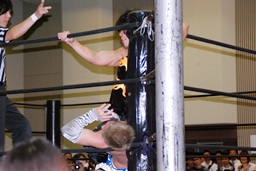 MIKAMIダブルアックスハンドル、ディーノは彰人にタッチ。MIKAMIエルボー、首投げからフェースカット、ミッキーブーメラン。コーナーに上ってスワントーンボム(右写真)、大石がカット。