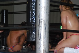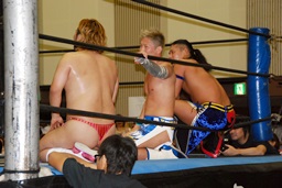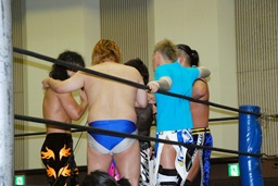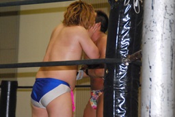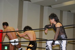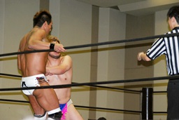 高梨コーナーに振って串刺しエルボー、大石かわしロープに振る、高梨切り返すが大石はランニングエルボー(左写真)、彰人にタッチ。高梨もMIKAMIにタッチ。
