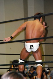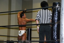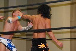 高梨大石の鼻をつまんで(右写真)チョップ、トラースキック、ロープに飛んでドロップキック。