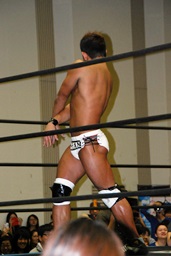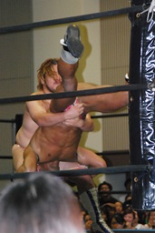 中条がブロックしたためゴッチ式で強引に持ち上げて(左写真)落とす。漢固めでカウント3。