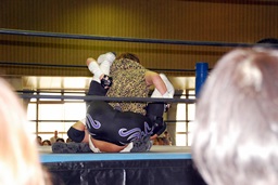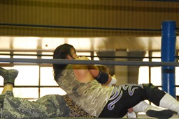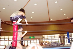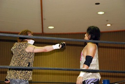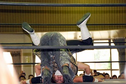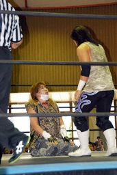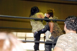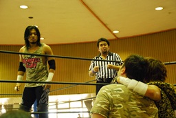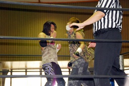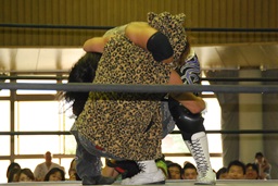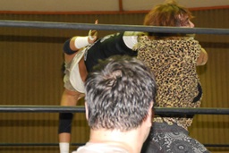 佐々木バック取ると(左写真)投げっぱなしジャーマン。ニラ場外エスケープ。