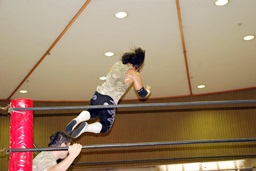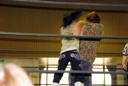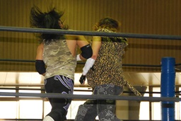 ロープに振ってドロップキック(右写真)、カウント2。再度片エビ、カウント2。
