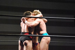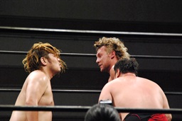 アントン「え〜、激闘を闘いぬきまして、3カウントを聞いて駆けよってきた大ちゃんが一言、『アンちゃん、鼻クソ出てるよ』。生まれてきて本当によかったです! DDTが大きくなればなるほど、我々の鼻クソの量は減っていきます。比喩です。しかしDDTは大きくなればなるほど、守るべきものがあると思っています。それは我々の鼻クソが出ているかのような試合です。このベルトを獲った私は今までもそうでしたが、このベルトの重みがある限り、Fuckの言葉を忘れずにやっていきたいと思います。それでは、3、2、1、世の中に中指立てるぜ!Fuck YOU!!!」(左写真)